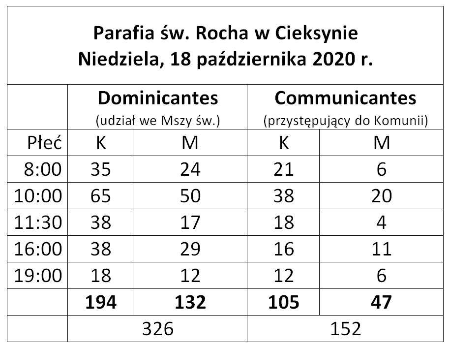 We wszystkich Mszach św. uczestniczyło 326 os. w tym 194 kobiety i 132 mężczyzn.
