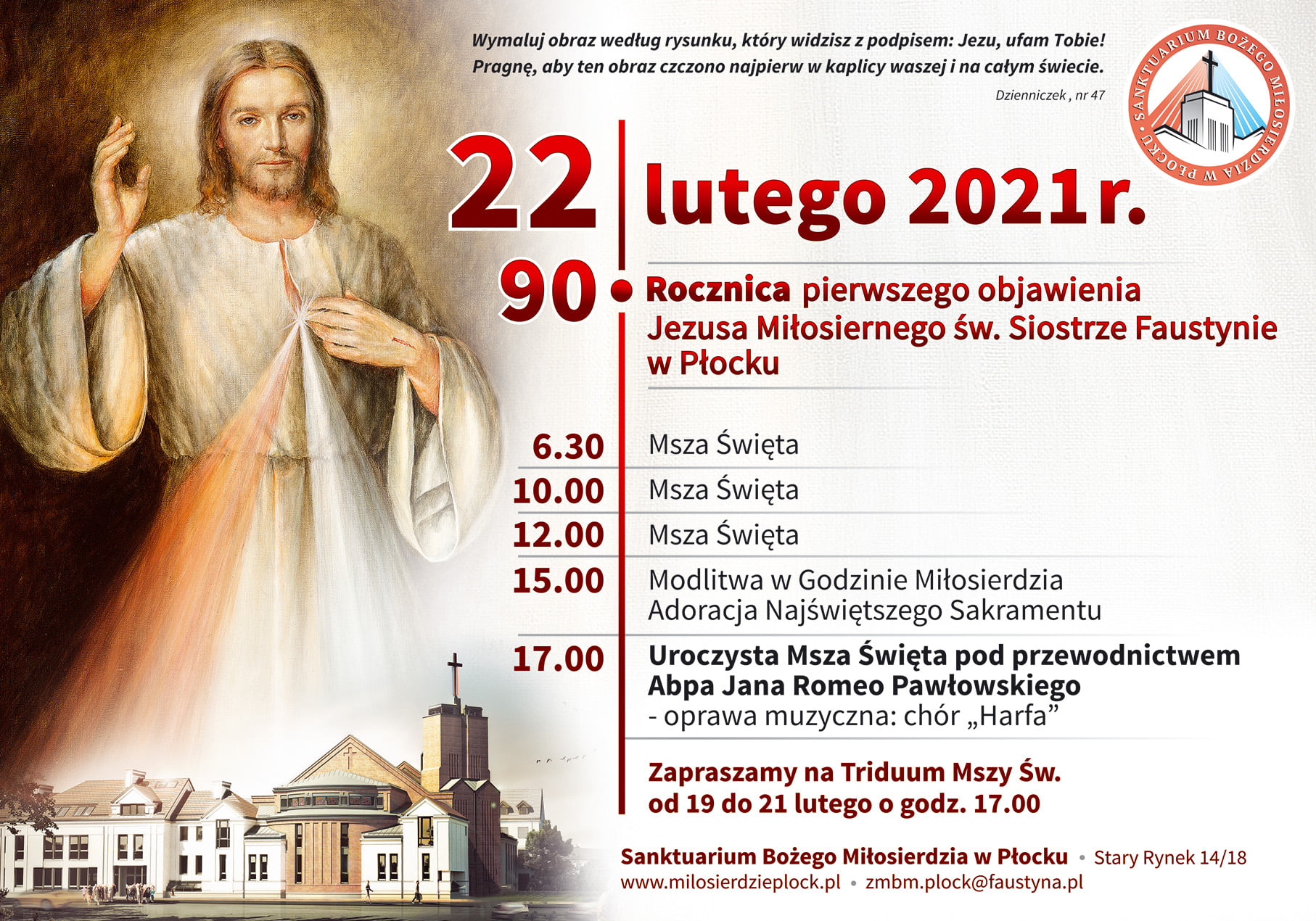 Główne uroczystości 90-lecia objawienia odbędą się w Sanktuarium Bożego Miłosierdziu w Płocku, w dniu 22 lutego 2021 r. o godzinie 17.00. Uroczystej Mszy św. będzie wtedy przewodniczył ks. Arcybiskup Jan Romeo Pawłowski z Watykanu.